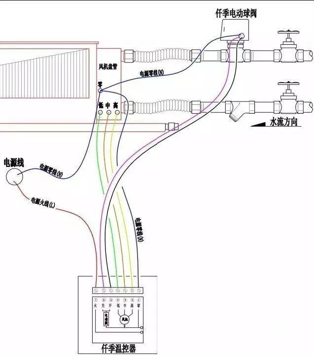 2、蓝线为零线(N),盘管、二通阀、温控器串联;